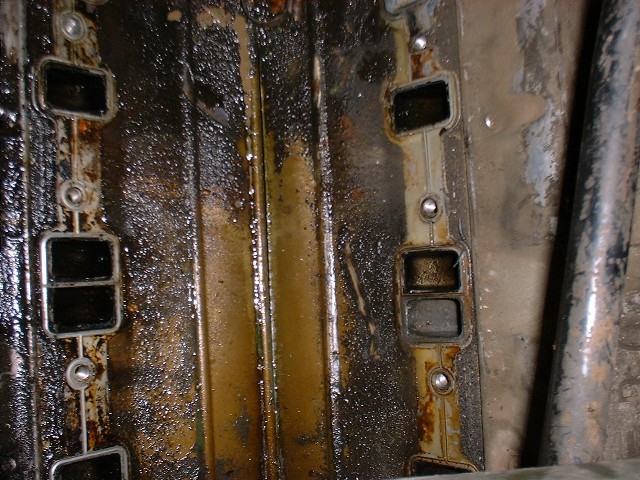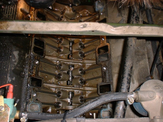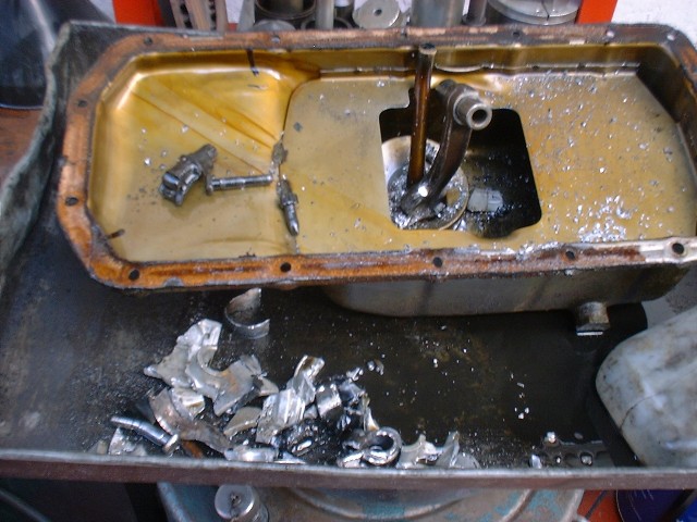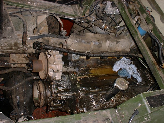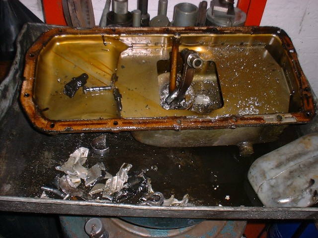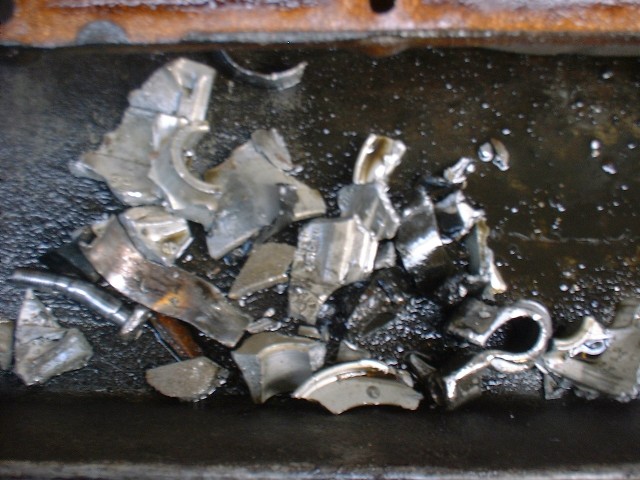but it was totally appropriate for this page :-( On Wednesday 16th January 2002 on the way back from Doncaster doing just under 70mph on the M1 just South of Junction 33, Grumble blew the engine - in style... A few moments later a Police patrol pulled over. I lept out and went over to his car, got in and sat down. The officer was just finishing a call, turned to me and said "That's a 101 isn't it?" I was impressed (albeit nearly in tears). He'd stopped to see if we were alright and needed any assistance - the next 30 odd minutes were spent talking about Land Rovers as he'd previously owned a Rangie! There was little more to do other than call the RAC - who eventually sent a very nice man in a very (very) large flat-bed recovery vehicle to return us home, well, to Warrens workshop actually. The next day Warren called and asked if I was sitting down. A conrod had broken and thrown itself through the block. On the next few cranks it had thrown itself through the sump. My beloved V8, the very heart of Grumble, was a total 'write-off', with everything that could break, broken... An immediate transplant was needed. At times like this one thinks about alternative engines but I'm just so totally sold on the feel and sound of the superb Rover V8, that I didn't ponder too long on the possibility of sticking a Perkins Phaser or 300Tdi in there. A couple of calls later landed me again in the very capable hands of Craig Matthews, now a very good and somewhat cherished friend - and the Northern Rep for the 101 Club. Craig had, buried away somewhere, a take-out recon engine, which was still bolted to the metal frame. A week later, almost to the minute that Grumble blew the engine, we were returning from Craigs, with the new engine on our trailer! The next week saw Warren pulling the old engine out and putting the new one in! As I write, Grumble is now back on form, even better and a bit quieter than before. The following pics show various stages of damaged engine parts, broken pistons, bent pushrods, fragments of anything that used to be crank or cam shafts (two of the cams were gone altogether) and a fundamental flaw in the valley gasket - which was split along the entire length! |